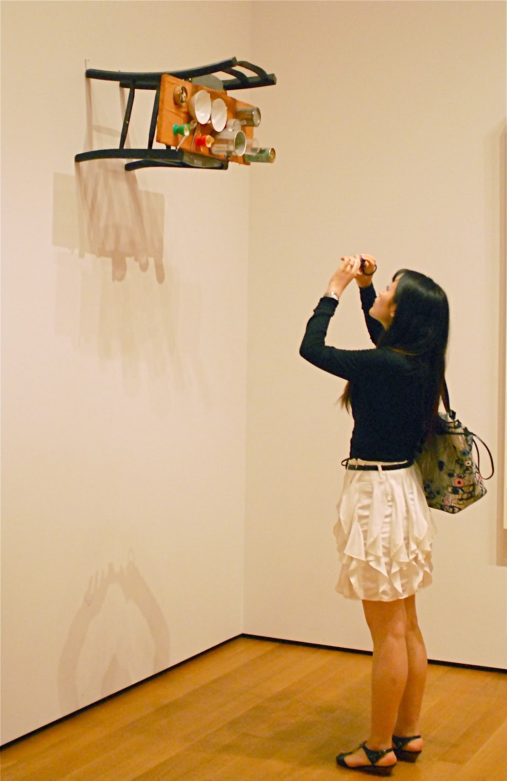 Daniel Spoerri, Swiss artist born in Romania (b. 1930) created this piece called "Kichka's Breakfast I" in 1960. It is composed of wood chair hung on wall with board across seat, coffeepot, tumbler, food, china, egg cups, eggshells, cigarette butts, spoons, tin cans and other materials. A "paster of found situations", Spoerri made this artwork from his girlfriend Kichkas's leftover breakfast. The sculpture is mounted on the wall so it "defies the laws of gravity" and the "view to which we are accustomed." The sculpture is now on view at the Museum of Modern Art.