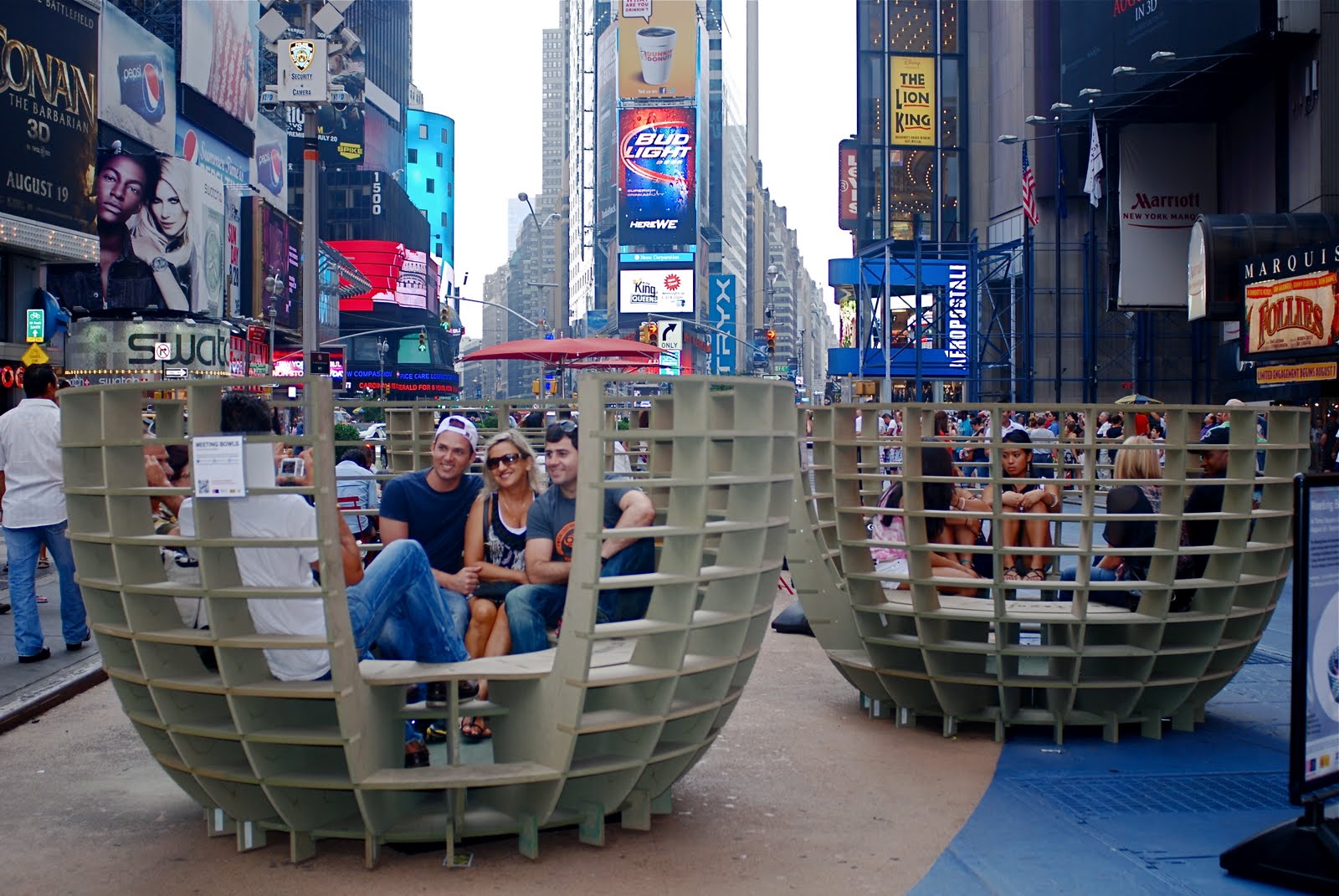 Meeting Bowls are temporary and playful urban furniture recently installed in Times Square at Broadway and 46th Street. The public furniture is designed for meeting and getting to know people, group discussions and friendly dialogue between strangers in a close yet pleasant space in the "crossroads of the world." Looking more like baskets, the fixtures are part of a month long outdoor art experiment on urban furniture. Each of the three Meeting Bowls are made from CNC cut fiber board. Spanish artists designed and constructed a prototype in Spain and sent the digital drawings to a fabricator in New Jersey who produced the final pieces. Each bowl seats up to 8 persons. The installation is a creation of mmmm..., a collaboration of Alberto Alarcon, Emilio Alarcon, Ciro Marquez and Eva Salmeron from Madrid, Spain. The public art project continues through September 16.