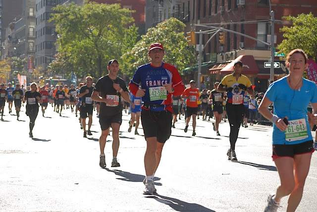 Yesterday, the 42nd annual New York City Marathon (branded ING New York City Marathon for sponsorship) took place in the city in good weather conditions. The ING New York City marathon is a major annual marathon (42.195 km/26.219 mi) that courses through the five boroughs of New York City. It is one of the largest marathons in the world, with 45,103 finishers last year. Along with the Boston Marathon and Chicago Marathon, it is among the pre-eminent long-distance annual running events in the United States and is one of the World Marathon Majors. The race is organized by New York Road Runners (NYRR) and has been run every year since 1970. In recent years, it has been sponsored by the financial group ING. It is held on the first Sunday of November and attracts professional competitors and amateurs from all over the world. Some runners don costumes during the event as shown in the pictures above. Because of the popularity of the race, participation is chosen largely by a lottery system. Runners who are members of NYRR can gain entry by meeting the qualifications for guaranteed entry or via nomination from an official running club. Kenyan Geoffrey Mutai won the men's New York City marathon Sunday, setting a new course record with a finish time of two hours, five minutes and six seconds. Mutai was awarded $130,000 for winning the race. Ethiopia's Firehiwot Dado won the women's contest, finishing in two hours, 23 minutes and 15 seconds. It was also reported that a couple got married while running the marathon. Some 47,000 people competed in yesterday's event.