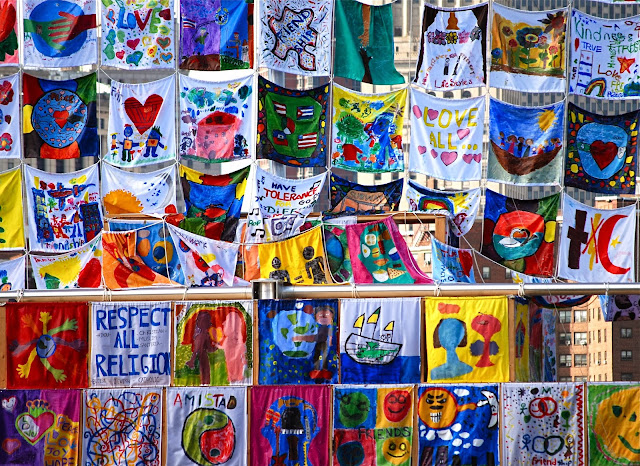 Ship of Tolerance is a conceptual art installation which aims to educate and connect youth of different continents, cultures and identities through the language of art. The ship's sails are stitched together from paintings by hundreds of schoolchildren from different ethnic and social backgrounds to convey a message of tolerance and hope. Originally modeled after an ancient Egyptian sailing vessel, the Ship is constructed with a wood frame and measures approximately 66-feet long by 23-feet wide. The ship is now on view on the Brooklyn waterfront, docked on the East River between Brooklyn Bridge and Manhattan Bridge until October 8th. It was part of this year's DUMBO Arts Festival last weekend.