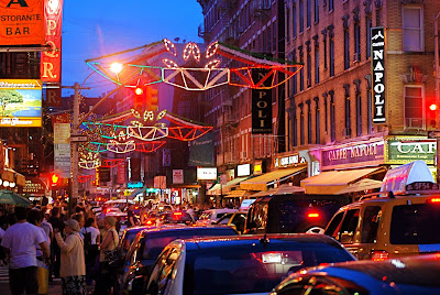 This is Little Italy, a neighborhood in lower Manhattan once known for its large population of Italians. The neighborhood has become more of a tourist destination than a residential neighborhood. Previously, Little Italy spread from Canal Street north to Houston Street. Today, the section of Mulberry Street between Broome and Canal Streets, lined with Italian restaurants popular with tourists, remains distinctly recognizable as Little Italy. Last Saturday night, we visited Little Italy and had dinner at a fine restaurant called Il Cortile, located at 125 Mulberry Street. Little Italy is worth visiting for delicious imported Italian groceries and to see the Old St. Patrick's Cathedral, as well as a chance to glimpse some of the restaurants and bars made famous by gangsters and members of the Rat Pack.